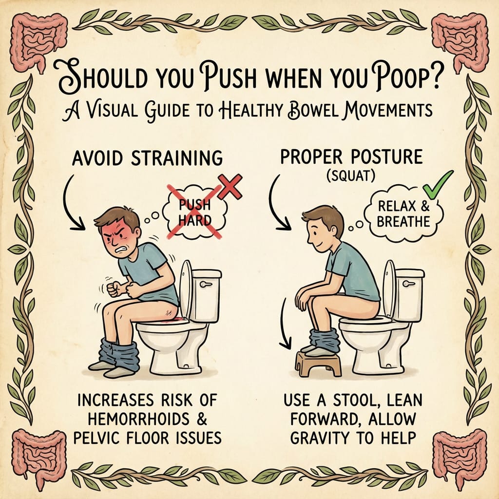 The bottom line on whether you should push when you poop: Yes, gentle coordinated pushing is normal and healthy, but forceful straining is harmful and usually unnecessary. Focus on proper positioning, adequate hydration, sufficient fiber, and responding to natural urges. When you need to push, use coordinated breathing and muscle activation rather than breath-holding strain.